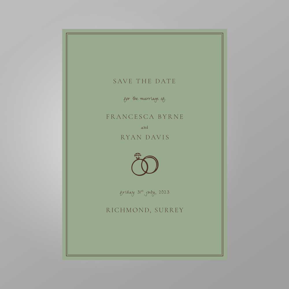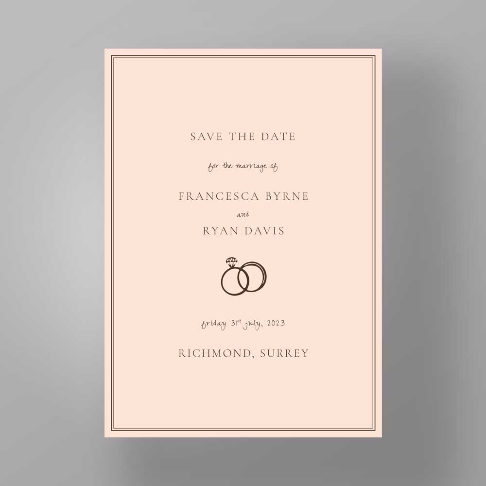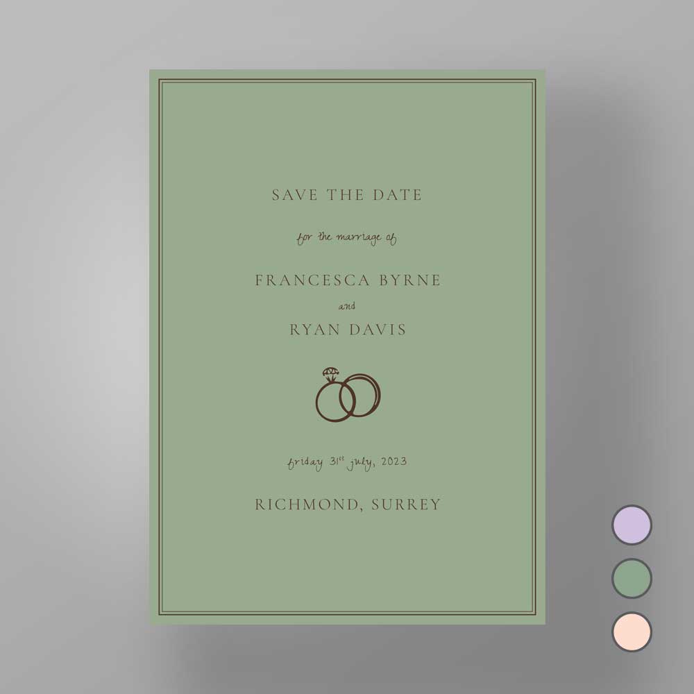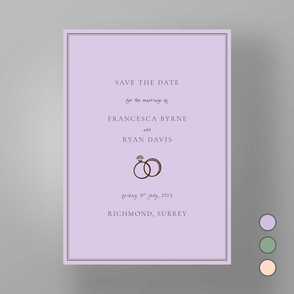 The Soho Soirée suite combines bold simplicity with artistic charm — featuring a clean black border, hand-sketched image, and a choice of softly hued backgrounds in peach, sage, or lilac. Perfect for couples seeking a contemporary invitation with a playful, editorial edge.