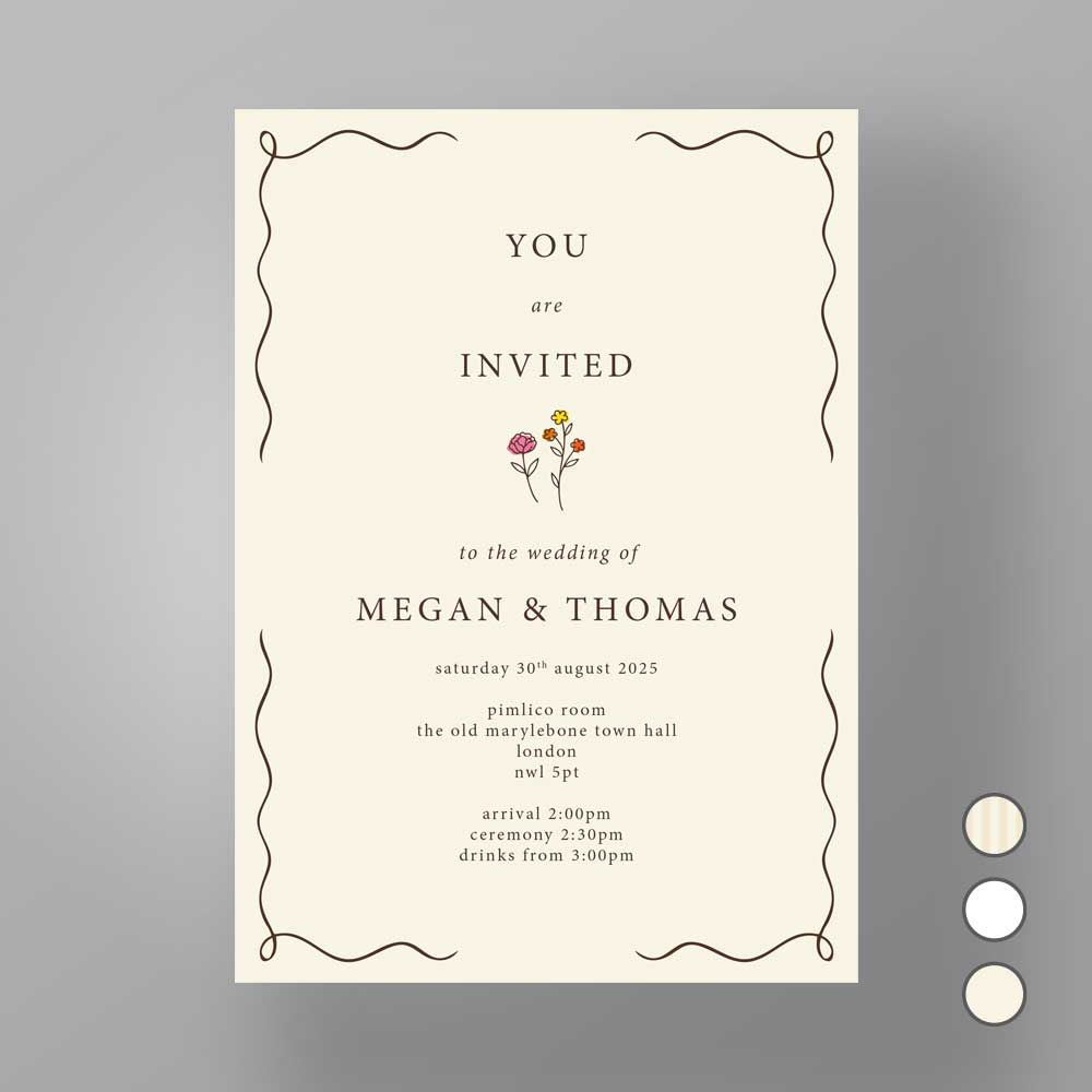 Effortlessly refined, the Marylebone Muse suite pairs clean typography with a soft neutral palette and subtle pinstripe detailing. Inspired by contemporary London style, it blends minimal design with timeless sophistication — perfect for couples who value understated elegance and modern form.