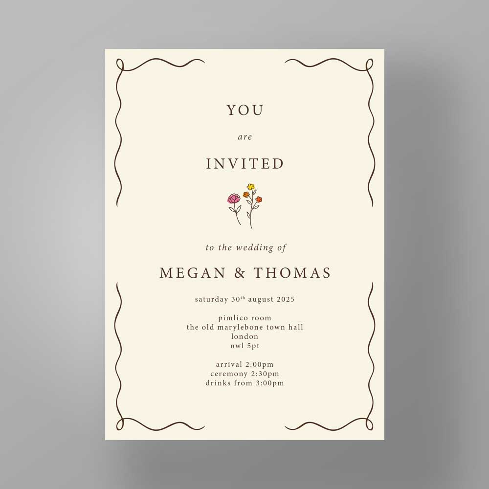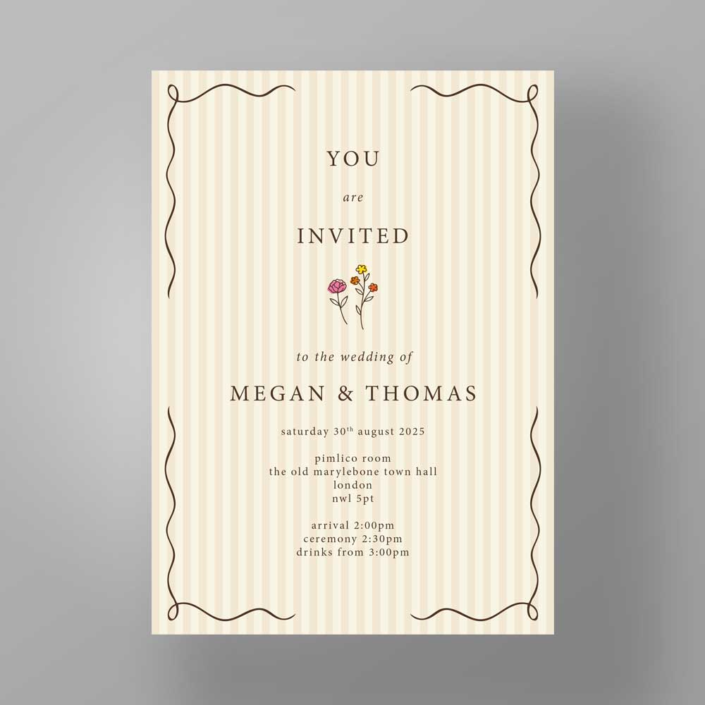 Effortlessly refined, the Marylebone Muse suite pairs clean typography with a soft neutral palette and subtle pinstripe detailing. Inspired by contemporary London style, it blends minimal design with timeless sophistication — perfect for couples who value understated elegance and modern form.