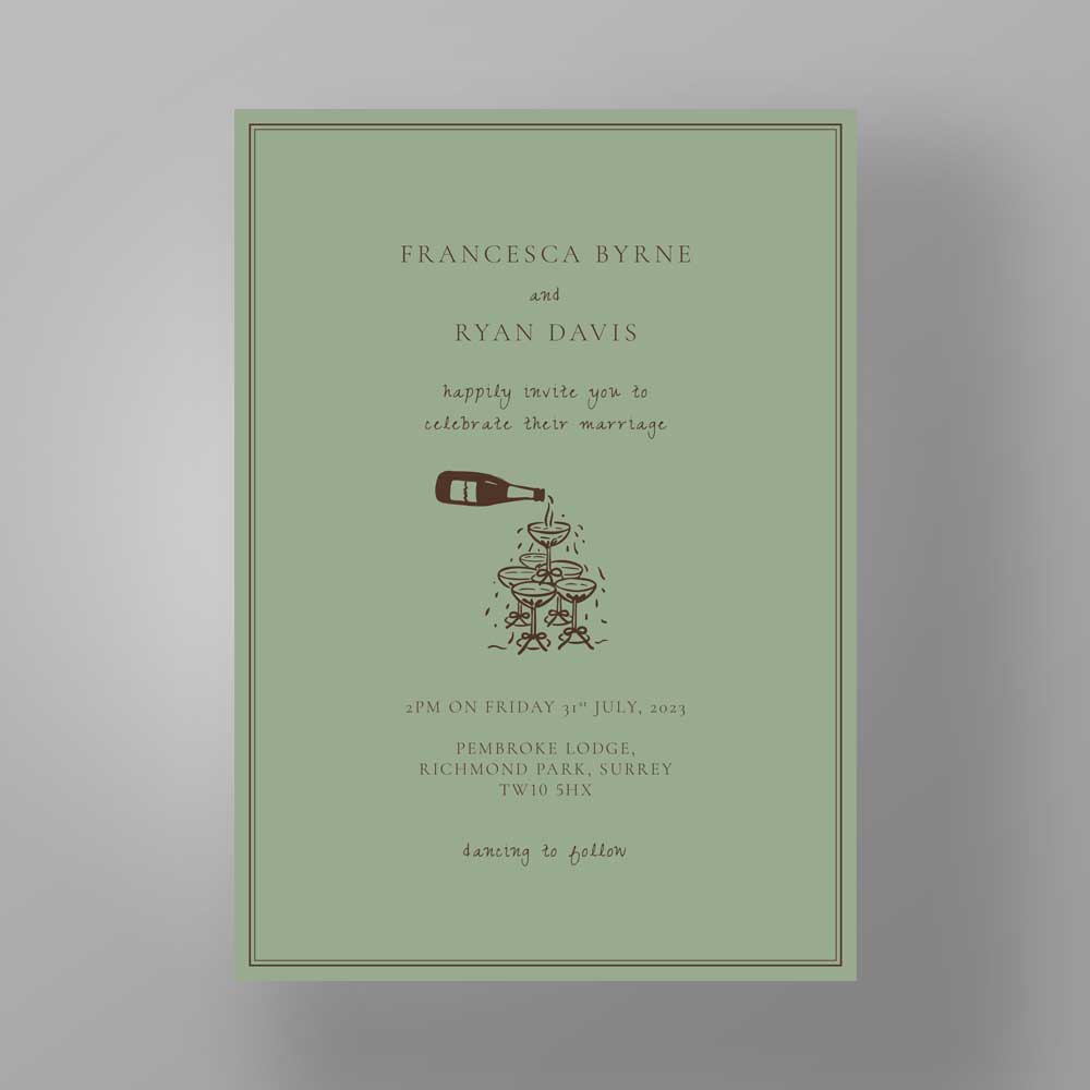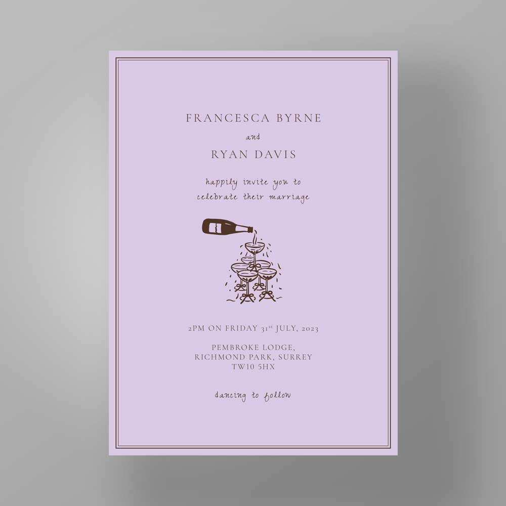 The Soho Soirée suite combines bold simplicity with artistic charm — featuring a clean black border, hand-sketched image, and a choice of softly hued backgrounds in peach, sage, or lilac. Perfect for couples seeking a contemporary invitation with a playful, editorial edge.