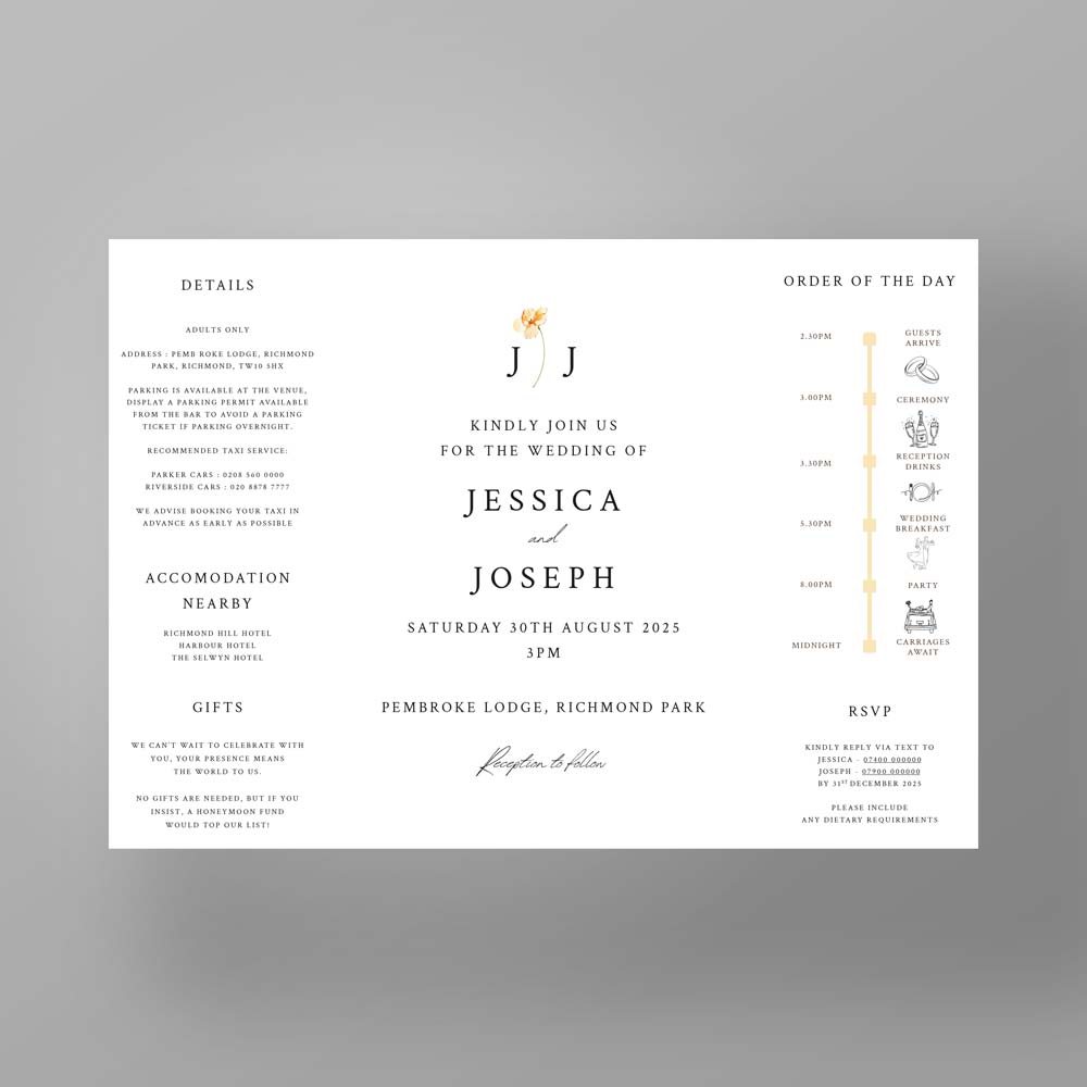A sophisticated and romantic wedding design that embodies elegance through minimalism and vibrant floral artistry. It features a single hand-painted yellow flower in warm golden tones, complemented by refined serif and graceful script typography for a fresh, romantic, and timeless aesthetic.