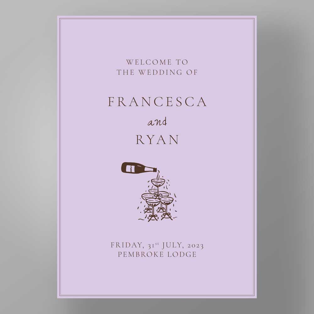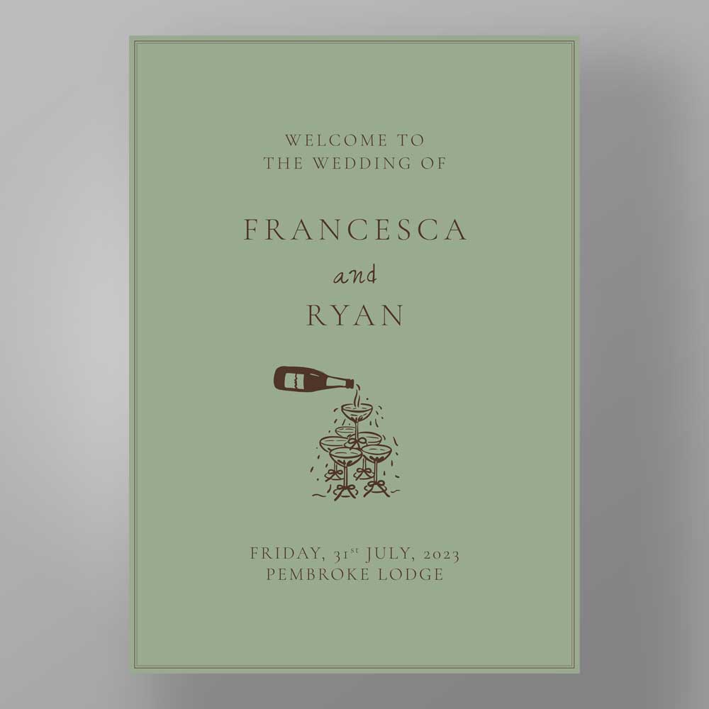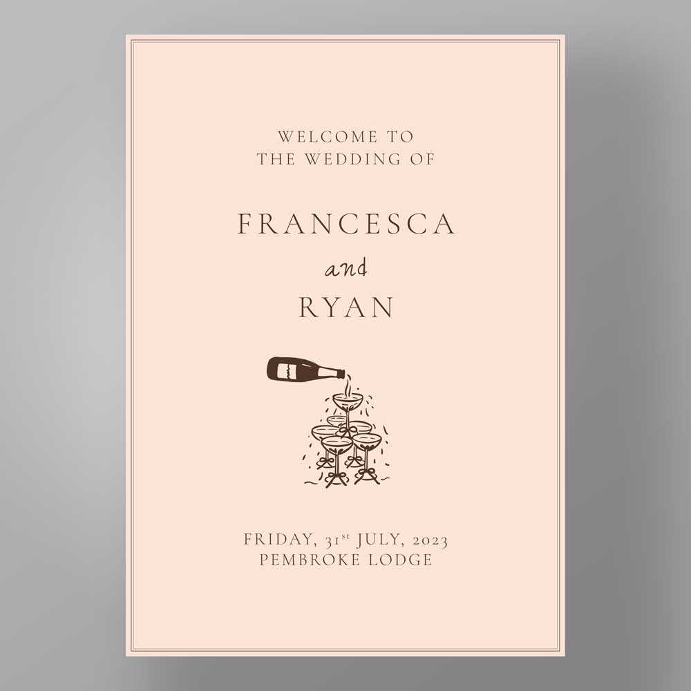The Soho Soirée suite combines bold simplicity with artistic charm — featuring a clean black border, hand-sketched image, and a choice of softly hued backgrounds in peach, sage, or lilac.