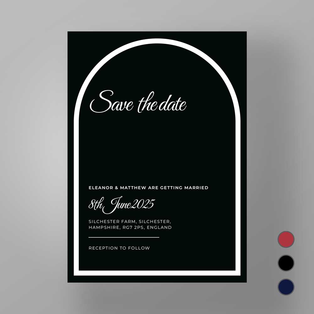 Striking and contemporary, this design celebrates clean curves and confident form. The bold arch silhouette paired with refined typography creates a statement look, ideal for couples seeking modern elegance with a timeless edge.