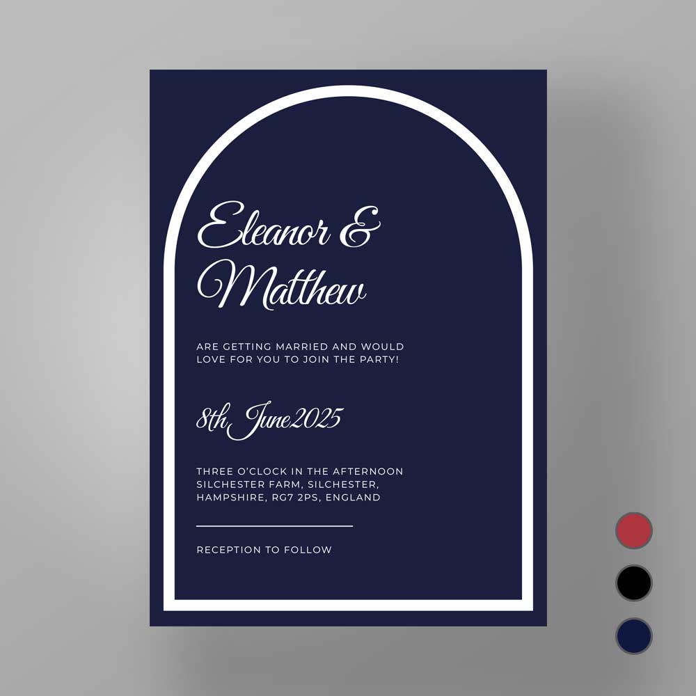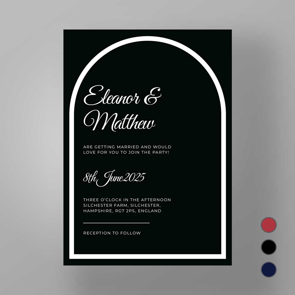 Striking and contemporary, this design celebrates clean curves and confident form. The bold arch silhouette paired with refined typography creates a statement look, ideal for couples seeking modern elegance with a timeless edge.