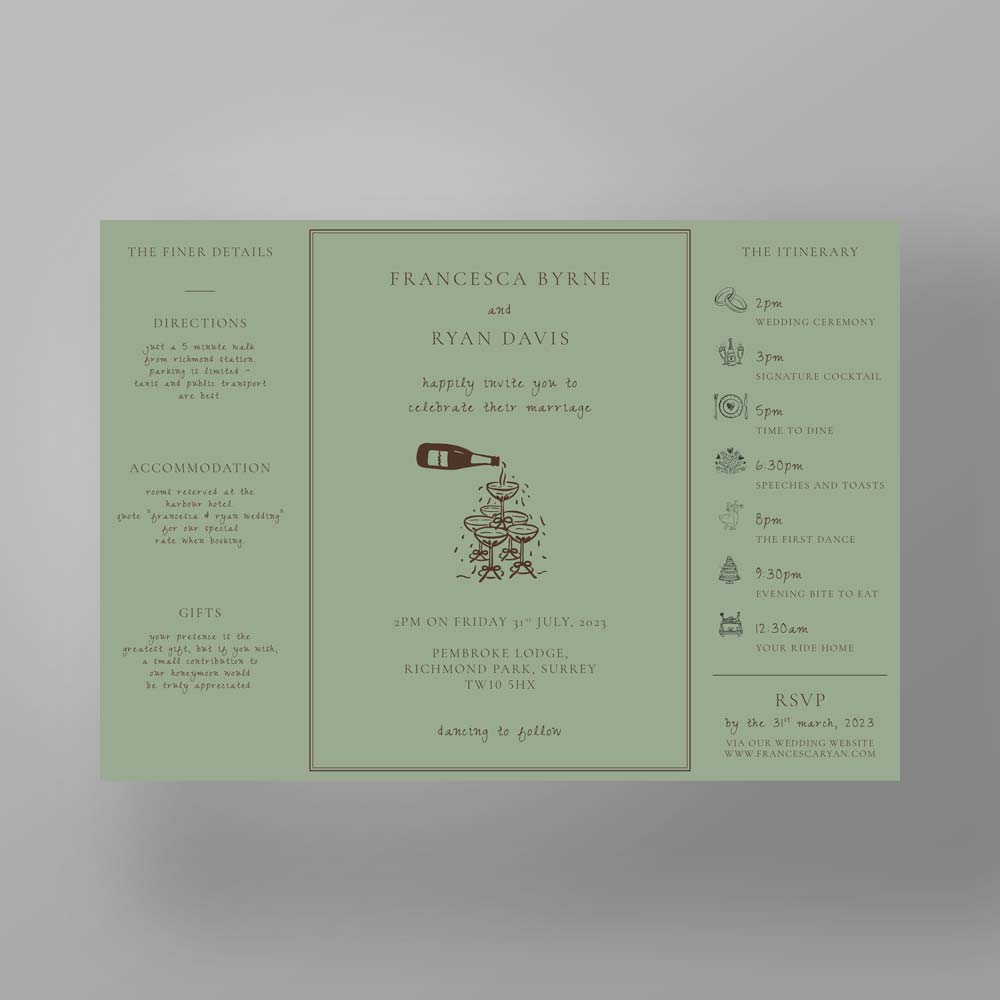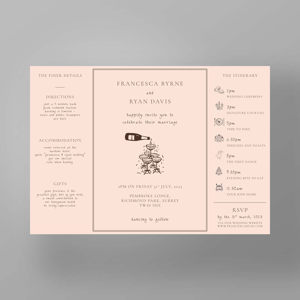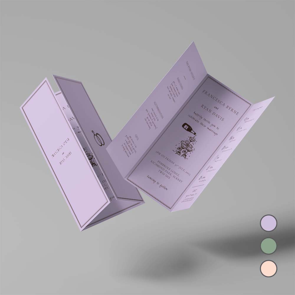 The Soho Soirée suite combines bold simplicity with artistic charm, featuring a clean black border, hand-sketched images, and a choice of softly hued backgrounds in peach, sage, or lilac. Perfect for couples seeking a contemporary invitation with a playful, editorial edge.